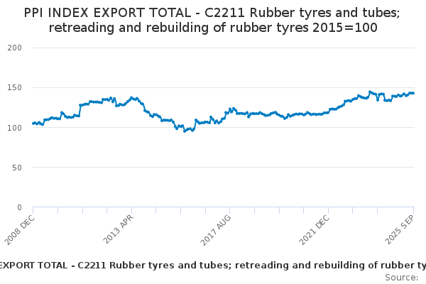 Download this time seriesPPI INDEX EXPORT TOTAL - C2211 Rubber tyres and tubes; retreading and rebuilding of rubber tyres 2015=100