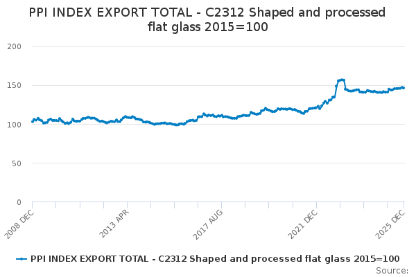Download this time seriesPPI INDEX EXPORT TOTAL - C2312 Shaped and processed flat glass 2015=100