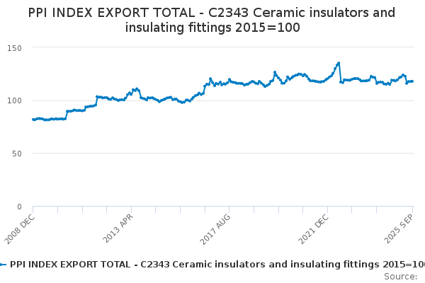 Download this time seriesPPI INDEX EXPORT TOTAL - C2343 Ceramic insulators and insulating fittings 2015=100