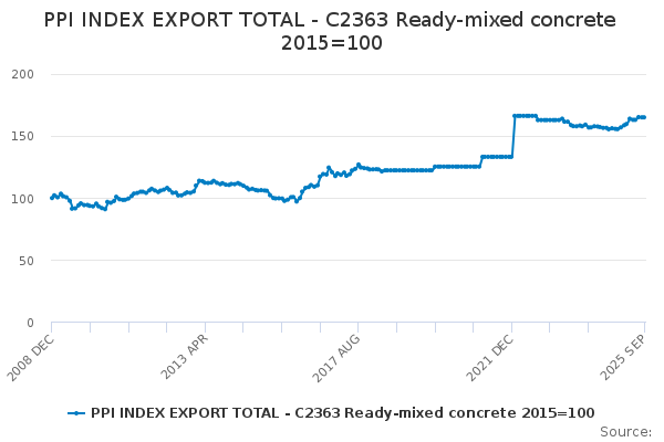 Download this time seriesPPI INDEX EXPORT TOTAL - C2363 Ready-mixed concrete 2015=100
