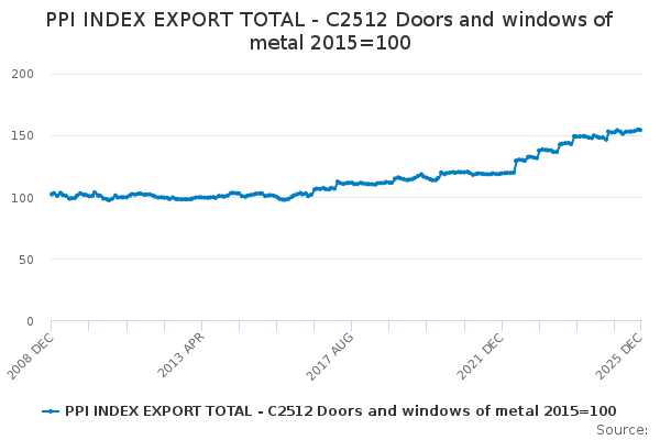 Download this time seriesPPI INDEX EXPORT TOTAL - C2512 Doors and windows of metal 2015=100