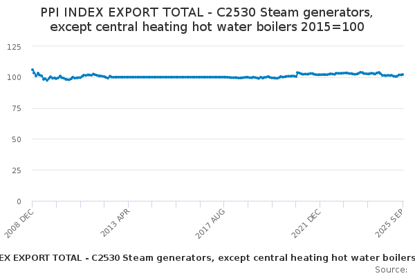 Download this time seriesPPI INDEX EXPORT TOTAL - C2530 Steam generators, except central heating hot water boilers 2015=100