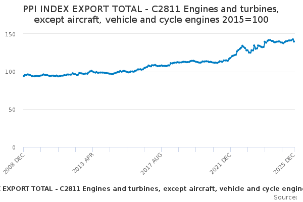 Download this time seriesPPI INDEX EXPORT TOTAL - C2811 Engines and turbines, except aircraft, vehicle and cycle engines 2015=100