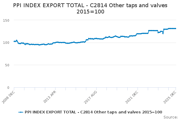 Download this time seriesPPI INDEX EXPORT TOTAL - C2814 Other taps and valves 2015=100