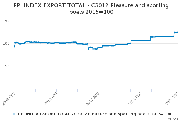 Download this time seriesPPI INDEX EXPORT TOTAL - C3012 Pleasure and sporting boats 2015=100