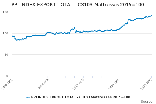 Download this time seriesPPI INDEX EXPORT TOTAL - C3103 Mattresses 2015=100
