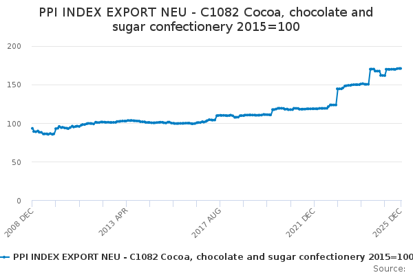 Download this time seriesPPI INDEX EXPORT NEU - C1082 Cocoa, chocolate and sugar confectionery 2015=100
