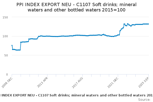 Download this time seriesPPI INDEX EXPORT NEU - C1107 Soft drinks; mineral waters and other bottled waters 2015=100