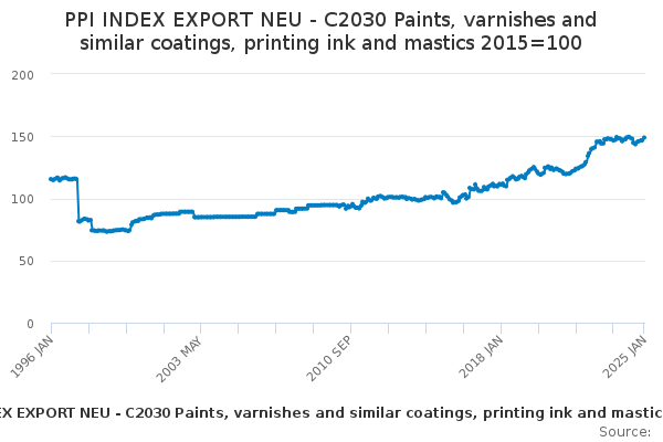 Download this time seriesPPI INDEX EXPORT NEU - C2030 Paints, varnishes and similar coatings, printing ink and mastics 2015=100