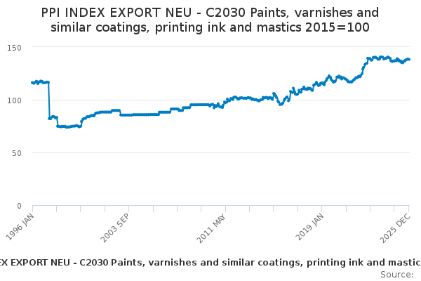 Download this time seriesPPI INDEX EXPORT NEU - C2030 Paints, varnishes and similar coatings, printing ink and mastics 2015=100