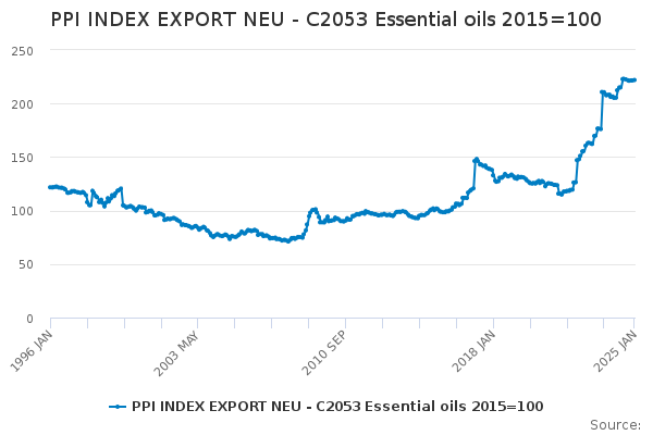 Download this time seriesPPI INDEX EXPORT NEU - C2053 Essential oils 2015=100