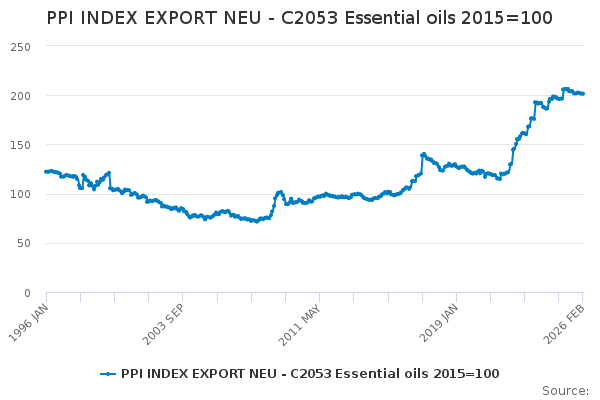 Download this time seriesPPI INDEX EXPORT NEU - C2053 Essential oils 2015=100