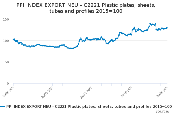 Download this time seriesPPI INDEX EXPORT NEU - C2221 Plastic plates, sheets, tubes and profiles 2015=100
