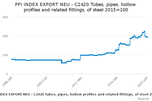 Download this time seriesPPI INDEX EXPORT NEU - C2420 Tubes, pipes, hollow profiles and related fittings, of steel 2015=100