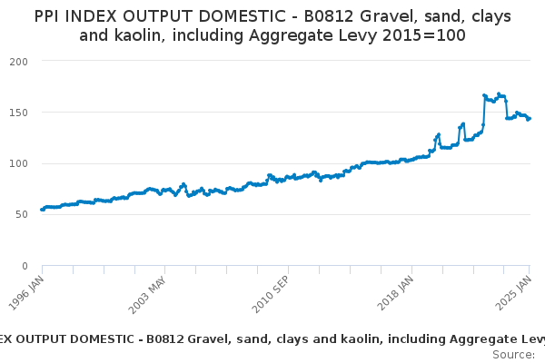 Download this time seriesPPI INDEX OUTPUT DOMESTIC - B0812 Gravel, sand, clays and kaolin, including Aggregate Levy 2015=100