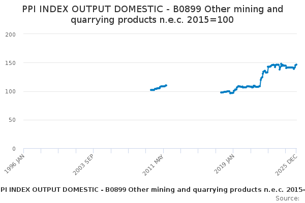 Download this time seriesPPI INDEX OUTPUT DOMESTIC - B0899 Other mining and quarrying products n.e.c. 2015=100