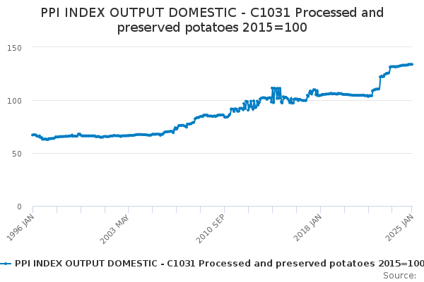 Download this time seriesPPI INDEX OUTPUT DOMESTIC - C1031 Processed and preserved potatoes 2015=100