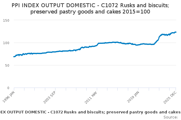 Download this time seriesPPI INDEX OUTPUT DOMESTIC - C1072 Rusks and biscuits; preserved pastry goods and cakes 2015=100