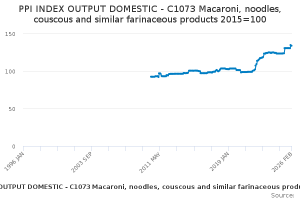 Download this time seriesPPI INDEX OUTPUT DOMESTIC - C1073 Macaroni, noodles, couscous and similar farinaceous products 2015=100