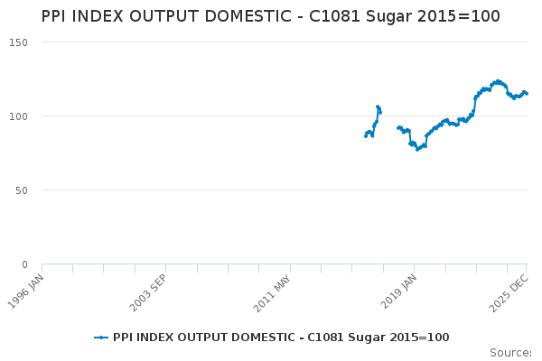 Download this time seriesPPI INDEX OUTPUT DOMESTIC - C1081 Sugar 2015=100