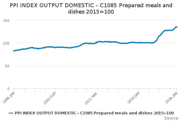 Download this time seriesPPI INDEX OUTPUT DOMESTIC - C1085 Prepared meals and dishes 2015=100