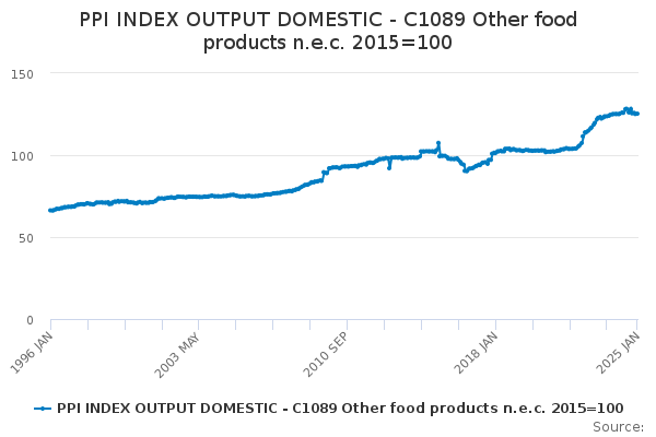 Download this time seriesPPI INDEX OUTPUT DOMESTIC - C1089 Other food products n.e.c. 2015=100