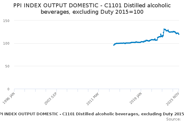 Download this time seriesPPI INDEX OUTPUT DOMESTIC - C1101 Distilled alcoholic beverages, excluding Duty 2015=100