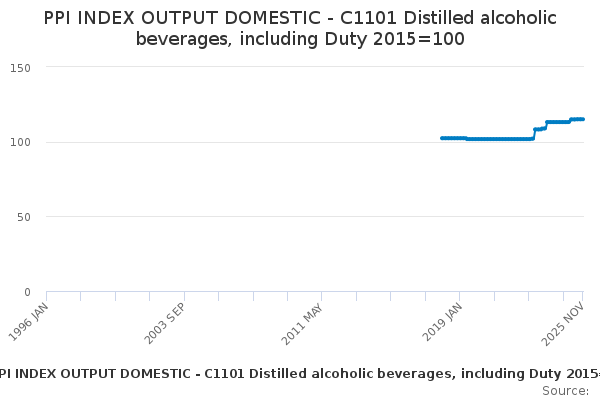 Download this time seriesPPI INDEX OUTPUT DOMESTIC - C1101 Distilled alcoholic beverages, including Duty 2015=100