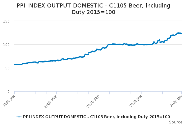 Download this time seriesPPI INDEX OUTPUT DOMESTIC - C1105 Beer, including Duty 2015=100