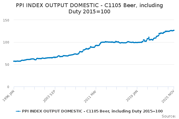 Download this time seriesPPI INDEX OUTPUT DOMESTIC - C1105 Beer, including Duty 2015=100
