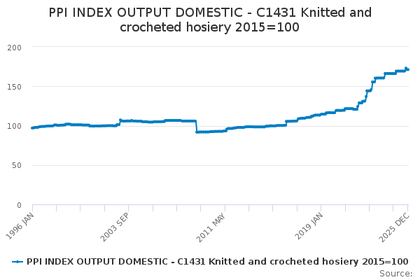 Download this time seriesPPI INDEX OUTPUT DOMESTIC - C1431 Knitted and crocheted hosiery 2015=100