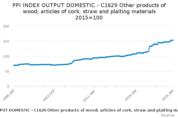 Download this time seriesPPI INDEX OUTPUT DOMESTIC - C1629 Other products of wood; articles of cork, straw and plaiting materials 2015=100