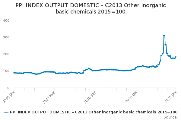 Download this time seriesPPI INDEX OUTPUT DOMESTIC - C2013 Other inorganic basic chemicals 2015=100