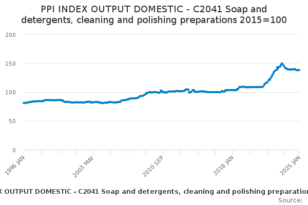 Download this time seriesPPI INDEX OUTPUT DOMESTIC - C2041 Soap and detergents, cleaning and polishing preparations 2015=100