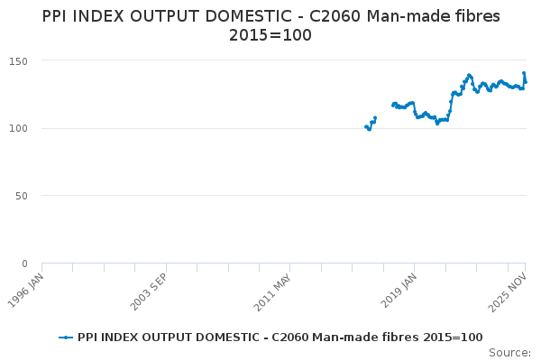 Download this time seriesPPI INDEX OUTPUT DOMESTIC - C2060 Man-made fibres 2015=100