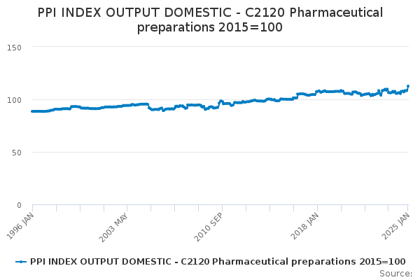 Download this time seriesPPI INDEX OUTPUT DOMESTIC - C2120 Pharmaceutical preparations 2015=100