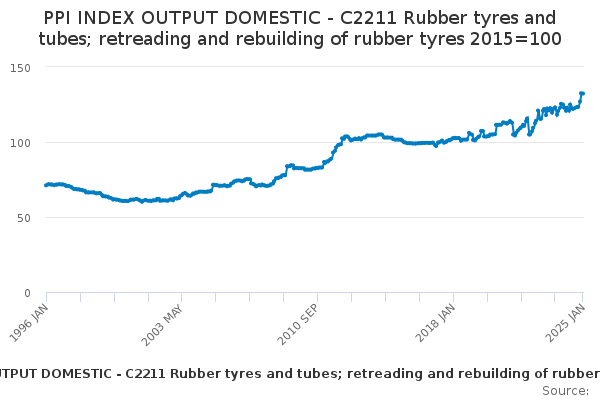 Download this time seriesPPI INDEX OUTPUT DOMESTIC - C2211 Rubber tyres and tubes; retreading and rebuilding of rubber tyres 2015=100