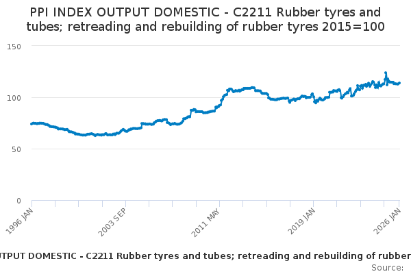 Download this time seriesPPI INDEX OUTPUT DOMESTIC - C2211 Rubber tyres and tubes; retreading and rebuilding of rubber tyres 2015=100