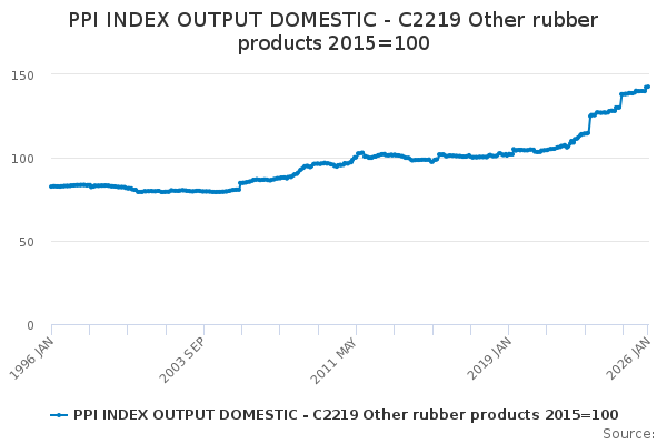Download this time seriesPPI INDEX OUTPUT DOMESTIC - C2219 Other rubber products 2015=100