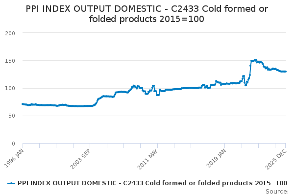 Download this time seriesPPI INDEX OUTPUT DOMESTIC - C2433 Cold formed or folded products 2015=100