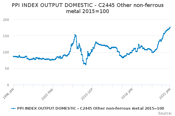 Download this time seriesPPI INDEX OUTPUT DOMESTIC - C2445 Other non-ferrous metal 2015=100
