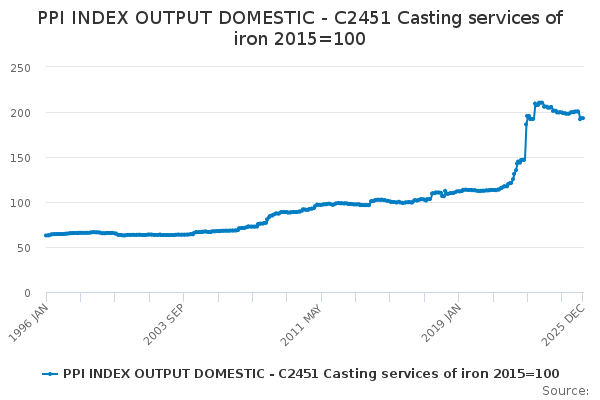 Download this time seriesPPI INDEX OUTPUT DOMESTIC - C2451 Casting services of iron 2015=100