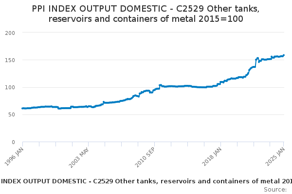 Download this time seriesPPI INDEX OUTPUT DOMESTIC - C2529 Other tanks, reservoirs and containers of metal 2015=100