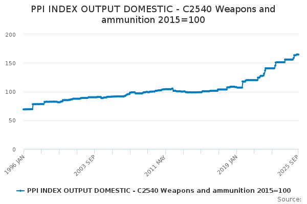 Download this time seriesPPI INDEX OUTPUT DOMESTIC - C2540 Weapons and ammunition 2015=100