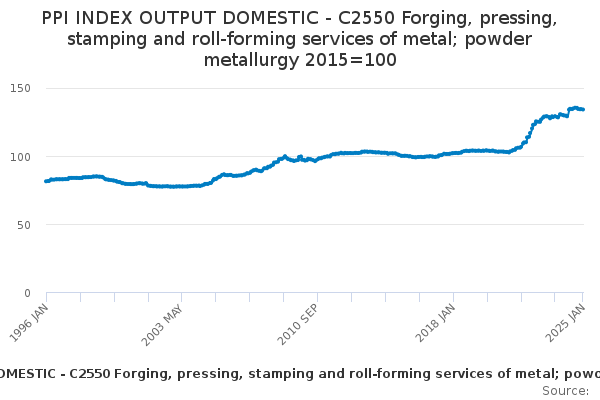 Download this time seriesPPI INDEX OUTPUT DOMESTIC - C2550 Forging, pressing, stamping and roll-forming services of metal; powder metallurgy 2015=100