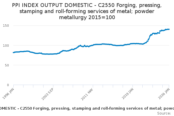 Download this time seriesPPI INDEX OUTPUT DOMESTIC - C2550 Forging, pressing, stamping and roll-forming services of metal; powder metallurgy 2015=100