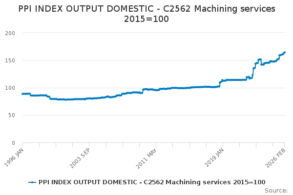 Download this time seriesPPI INDEX OUTPUT DOMESTIC - C2562 Machining services 2015=100