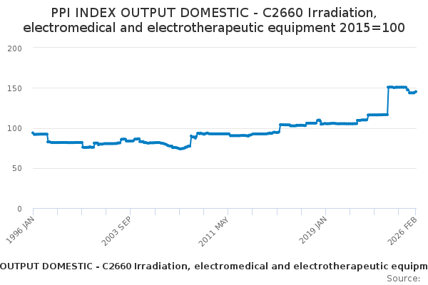 Download this time seriesPPI INDEX OUTPUT DOMESTIC - C2660 Irradiation, electromedical and electrotherapeutic equipment 2015=100