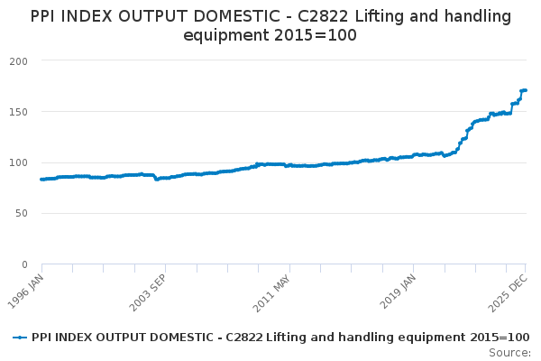 Download this time seriesPPI INDEX OUTPUT DOMESTIC - C2822 Lifting and handling equipment 2015=100