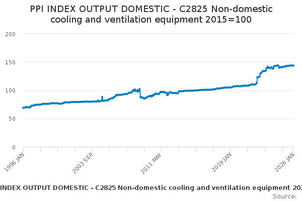 Download this time seriesPPI INDEX OUTPUT DOMESTIC - C2825 Non-domestic cooling and ventilation equipment 2015=100
